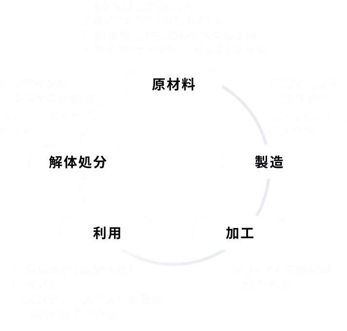 100%リサイクル可能は資源の有効活用と廃棄物削減に効果を発揮し、長寿命・メンテナンスフリーで環境負荷を低減。