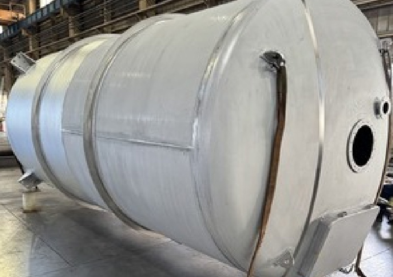 こちらの製品は、産業向け設備で使われる大型のステンレスタンクになります。材質は耐蝕性に優れたSUS316Lを使用、厚みは9㎜、サイズは外径3m×長さ18m、重さ約13tの大型製品です。 -