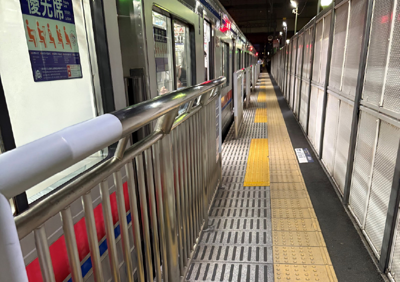 外径89.1mmのパイプの表面をヘアライン研磨で仕上げており、表面傷が目立ちにくく、光沢を抑えたマットな質感を長期に渡って保ちます。上端部がホーム側へ曲がりのある形状が特徴です。