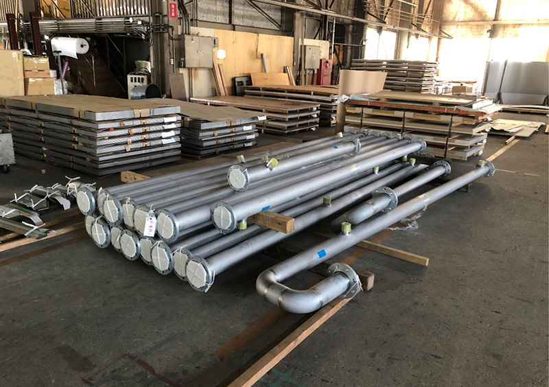 水再生センターで使用される配管設備です。これらの各種配管設備の製作にあたり、お客様よりいただいた配管図(アイソメ)だけを基にして、材料の拾い出し・手配から、切断・機械加工・溶接・酸洗処理・検査まで一式で請負いました。ノズルの先端部はパイプを潰すことで形状を出しておりますが、それにあたっては各サイズに合わせ木型を起こして、ベンダーで押し曲げて製作しております。また、配管の液だまり回避が必須のため、全て裏波溶接で仕上げています。これらは数量が非常に多い製品群でもありますが、当社の提携している加工業者は広い完成品の置き場スペースを持っていることもあり、その場での顧客の立ち会い検査も実施できました。さらに、お客様である水再生センターは都内でしたが、この広いスペースを関東圏内に有していたことからコストを抑えた輸送も実現いたしました。